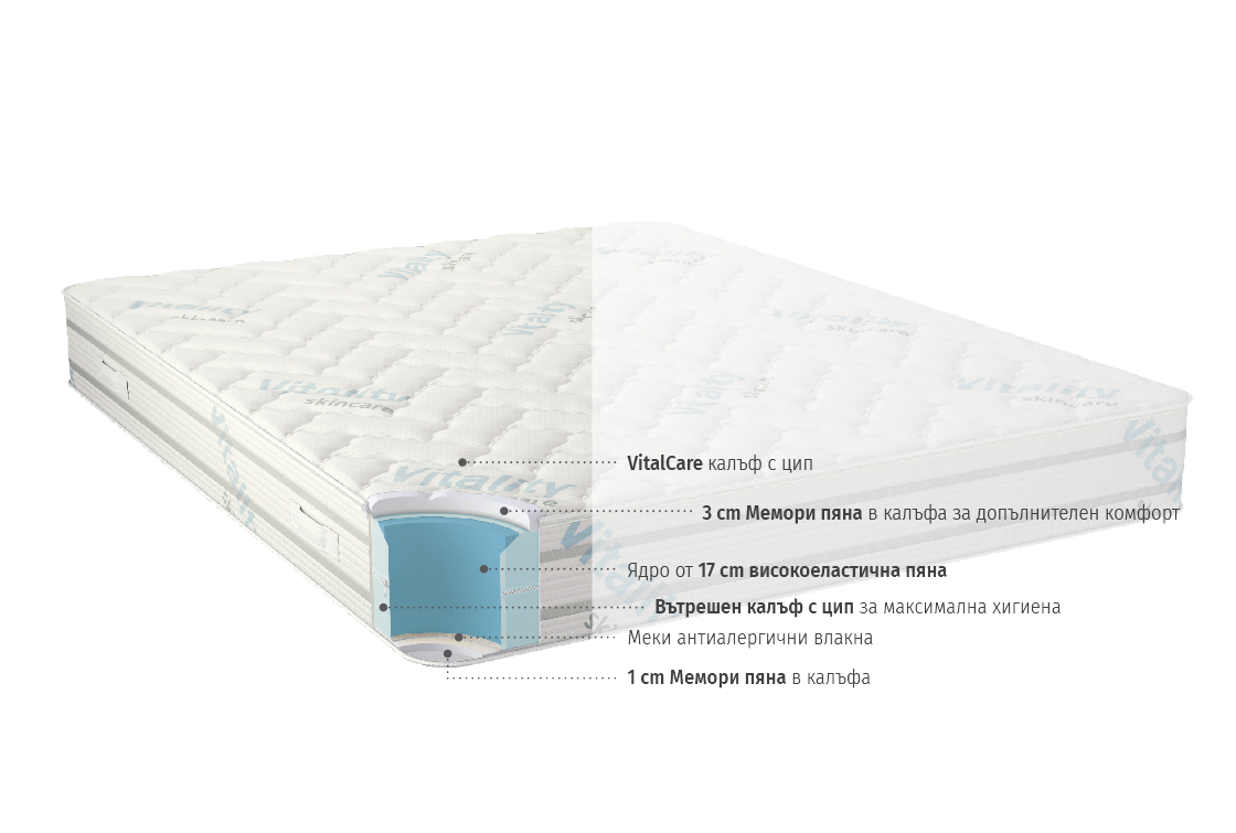 VitalCare e двулицев матрак със средна мекота. От едната му страна има 3 см мемори пяна, която разпределя равномерно тежестта на тялото и намалява въртенето по време на сън. Това дава допълнителен комфорт и възможност да се насладите на спокоен сън. От другата страна на матрака има 1 см мемори пяна, благодарение на което можете да избирате между две нива на твърдост. Текстилът е с вплетени меки влакна, третирани срещу акари и бактерии. Горната част на калъфа може да се отдели изцяло и да се използва като преносим топматрак от 100% мемори пяна.