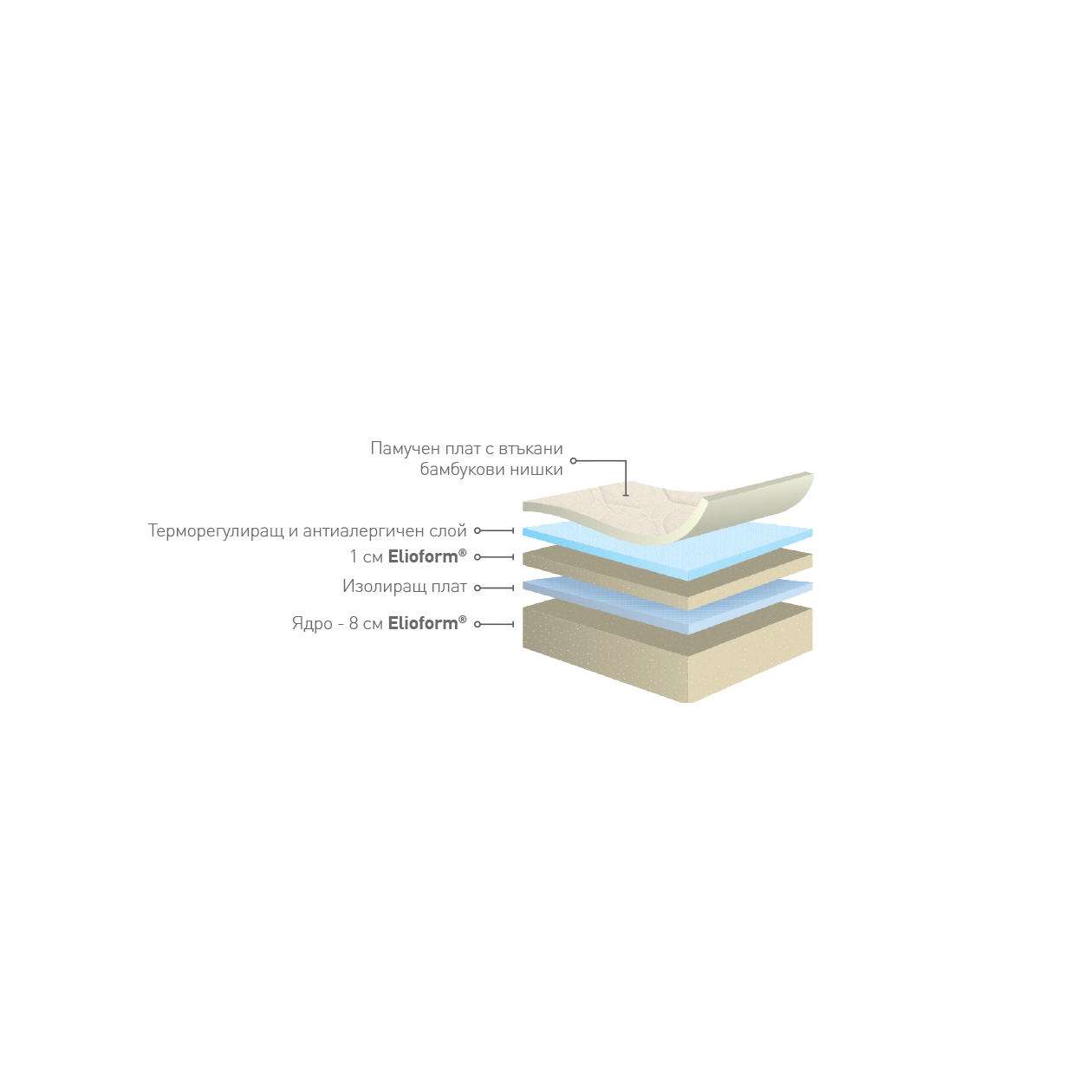 Baby Fiaba Bamboo е екологичен и ортопедичен матрак с бамбук. Сърцевината от Elioform пяна гарантира правилно физическо развитие на подрастващия детски организъм, а текстилът от памук с бамбукови влакна позволява лесна циркулация на въздуха. Моделът осигурява меко и свежо усещане и не позволява задържането на бактерии.