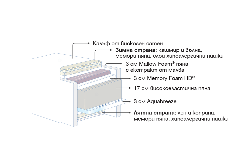 Пяната Aquabreeze е създадена по иновативна водна технология и притежава дълготрайна еластичност. Отворената й клетъчна структура позволява постоянен приток на въздух.