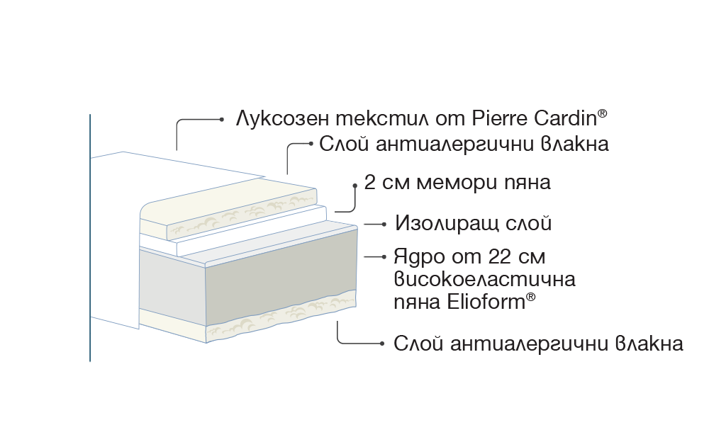 Текстилът на матрака е със стилен дизайн от Pierre Cardin. Хипоалергенен, нежен на допир и деликатен към кожата.